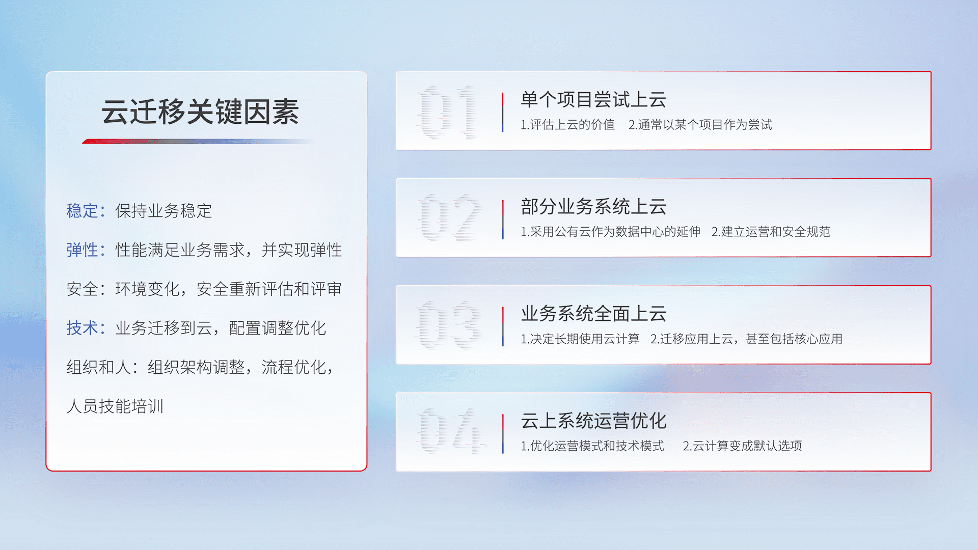结合实际业务,,从规划设计、、、云平台选型、、、云原生改造、、、数据迁移、、、、集成交付,,,迁移全过程为客户识别最佳上云路径,,,,做好风险识别管理,,,设计网络架构、、身份权限、、、安全审计合规、、、操作审计、、、日志审计、、、监控告警策略、、、、多站点容灾设计等,,对云上基础设施进行整体规划,,,,提升IT治理水平,,,以满足弹性、、、高可用、、高性能的需求。。。。