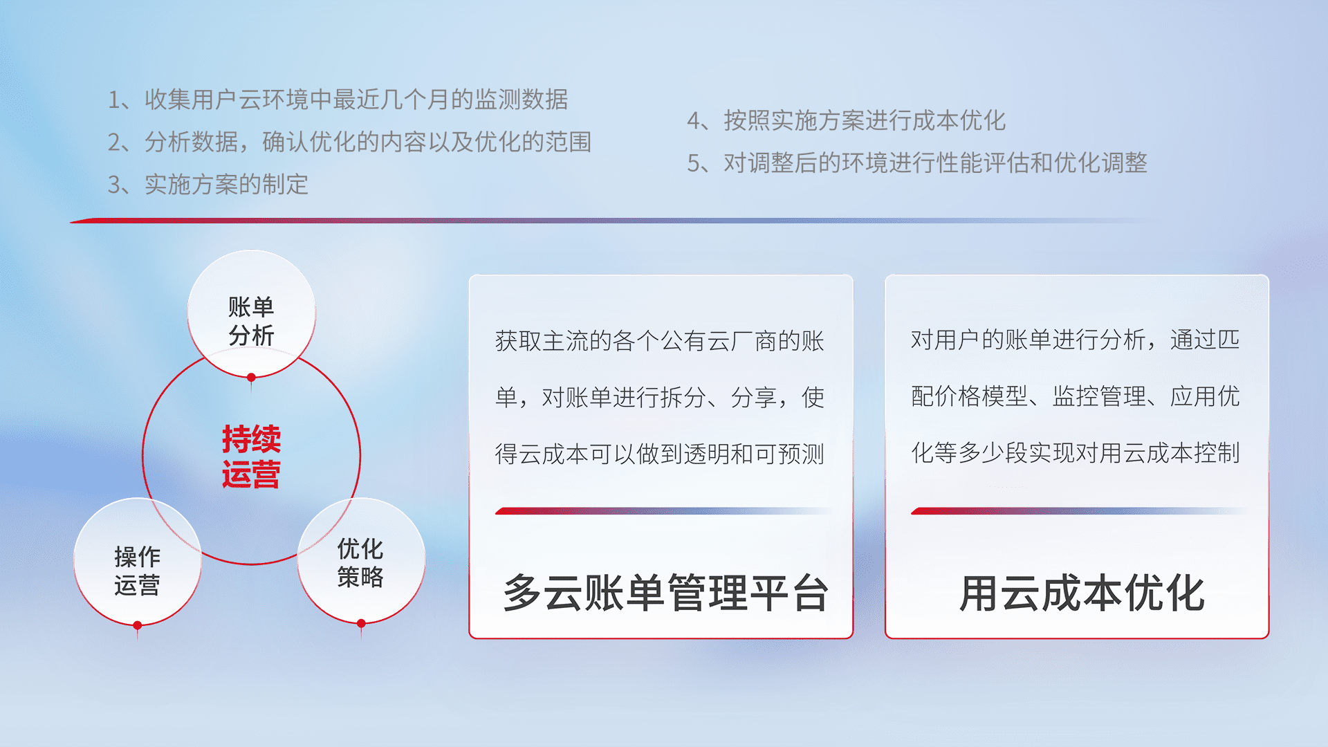 通过多云纳管,,,,以统一的资源数据模型把客户的云资源进行抽象和封装,,,进而实现对多云资源的统一操作,,,,保障云资源管理的可靠性、、、、稳定性与可用性。。量身定制化运维内容,,配置、、、、开发运维、、补丁管理、、、备份、、、监控、、、认证和访问管理、、审计和日常巡检等,,,保障在用云过程中的可靠度,,,稳定度以及高可用率。。。。